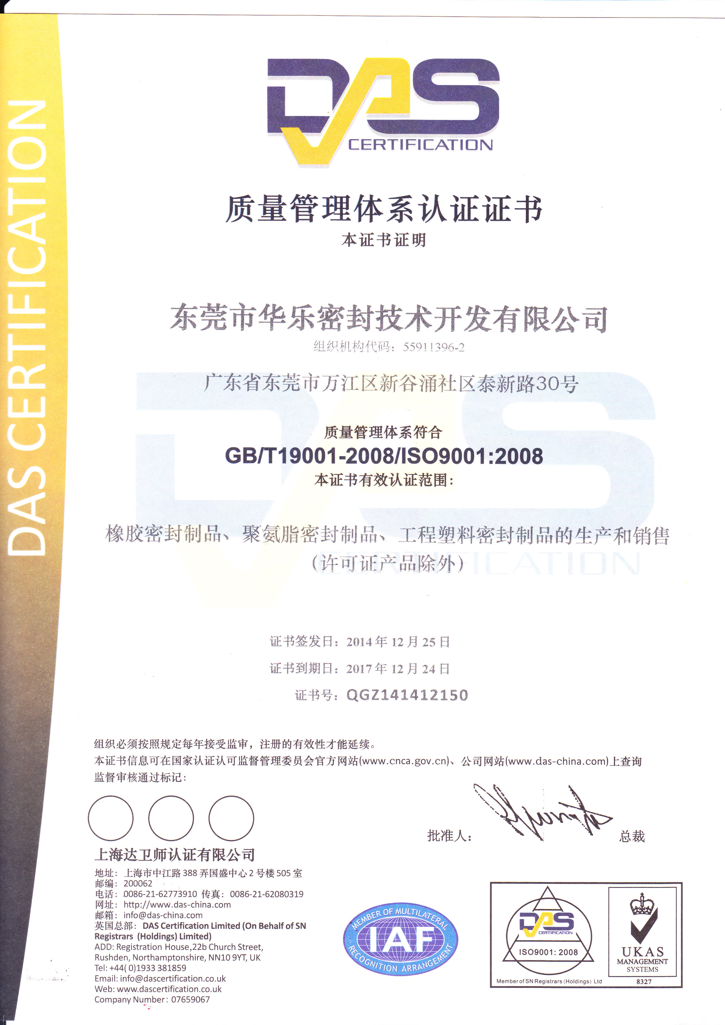 ISO9001: 2008 quality management system certification